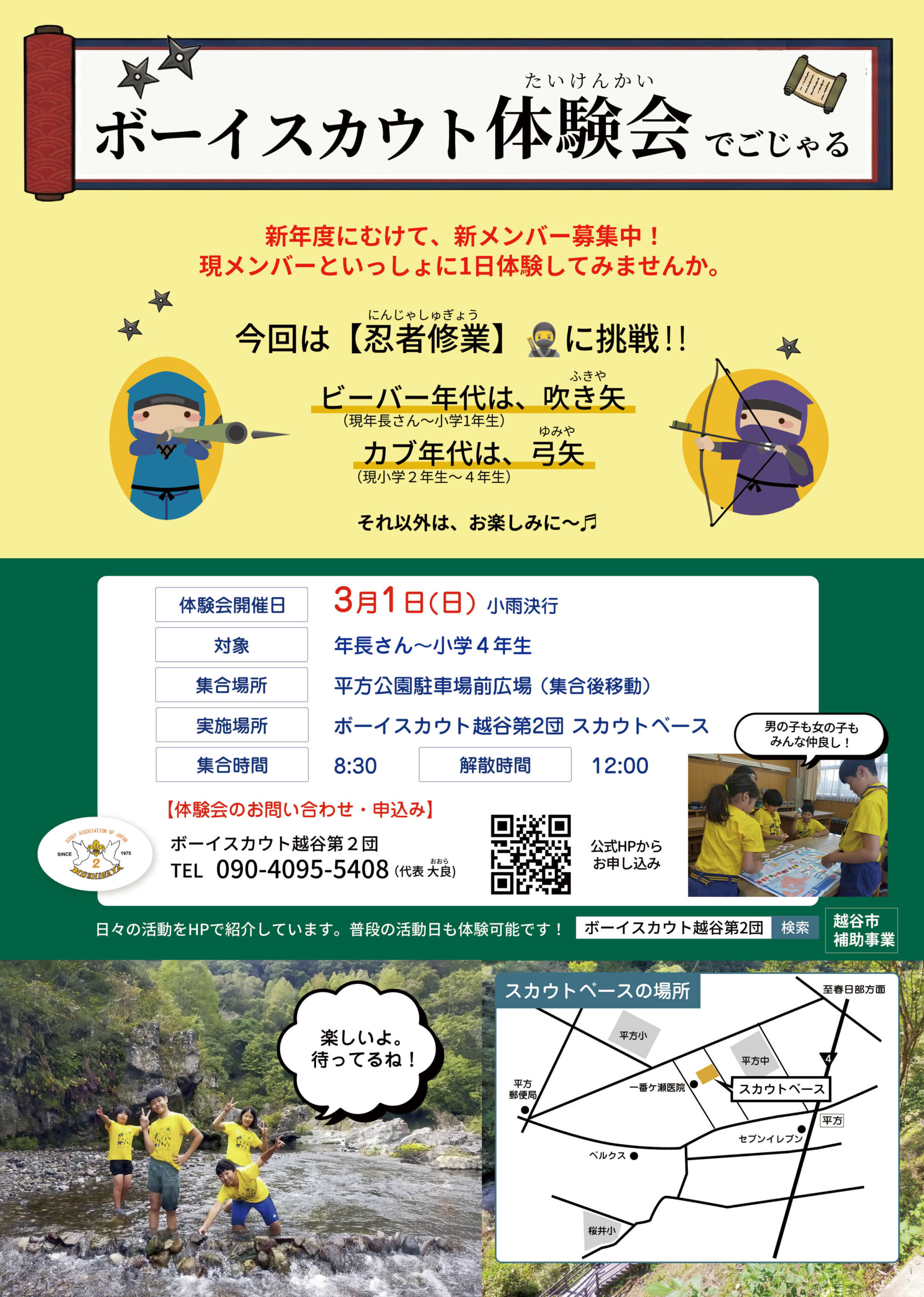 10月11日、ボーイスカウト越谷2団のカブ隊は、神川町へ2泊3日の秋季舎営へ出発しました。 今年のテーマは「忍者」。上級忍者になるため、たくさんの忍者修行に挑戦しました。 初めて舎営に参加する年下のスカウトもいましたが、…